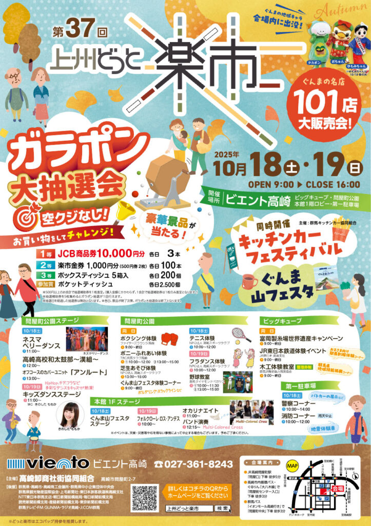 高崎問屋街の恒例イベント「上州どっと楽市」が、10月18日(土)・19日(日)の2日間、ビエント高崎で開催されます!