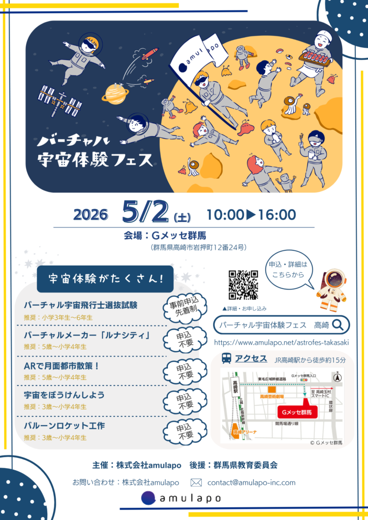 宇宙飛行士の選抜体験から工作・AR体験まで、宇宙をテーマにしたプログラムが集まる「バーチャル宇宙体験フェス in 高崎」がGメッセ群馬で開かれます。