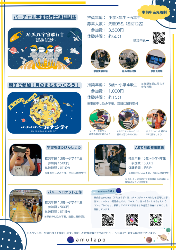 さらにARグラス(現実の景色にデジタル映像を重ねて表示する機器)を使って月面都市を歩く体験や、バルーンロケットを工作して実際に飛ばす実験なども実施されます。